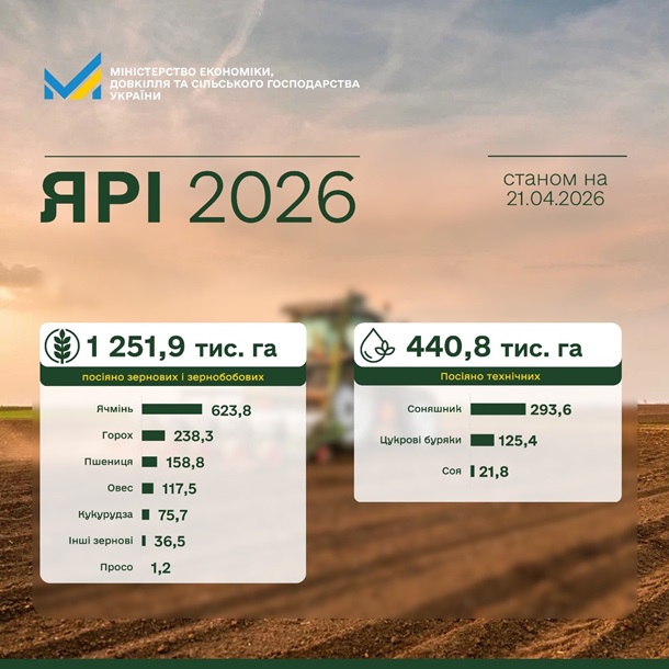 Станом на 20 квітня українські аграрії засіяли понад 1,25 млн гектарів ярих зернових і зернобобових культур, що становить п’яту частину від прогнозованих площ. Про це повідомила пресслужба Міністерства економіки, довкілля і сільського господарства у вівторок, 21 квітня.