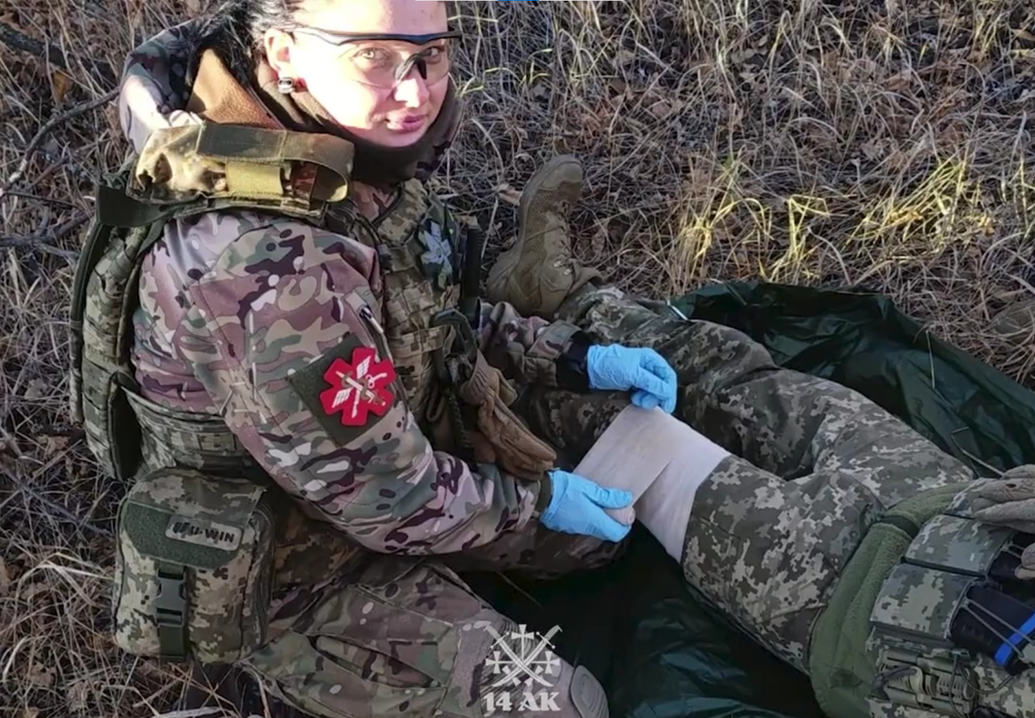 Бойова медикиня Олександра надає допомогу пораненому бійцю. Скрін з відео 14-го корпусу