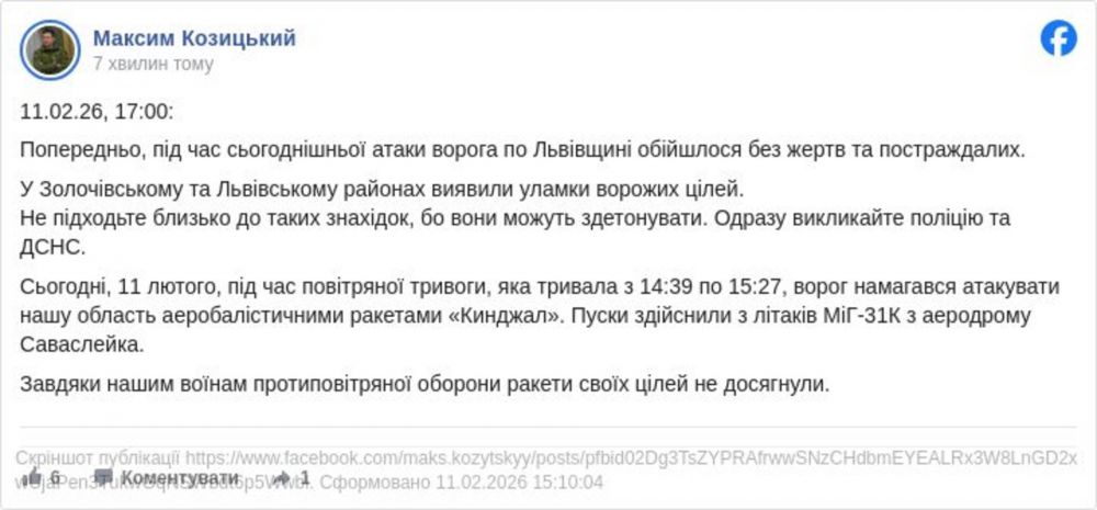 Сьогодні, 11 лютого, під час повітряної тривоги, яка тривала з 14:39 по 15:27, ворог намагався атакувати нашу область аеробалістичними ракетами «Кинджал». Пуски здійснили з літаків МіГ-31К з аеродрому Саваслейка.