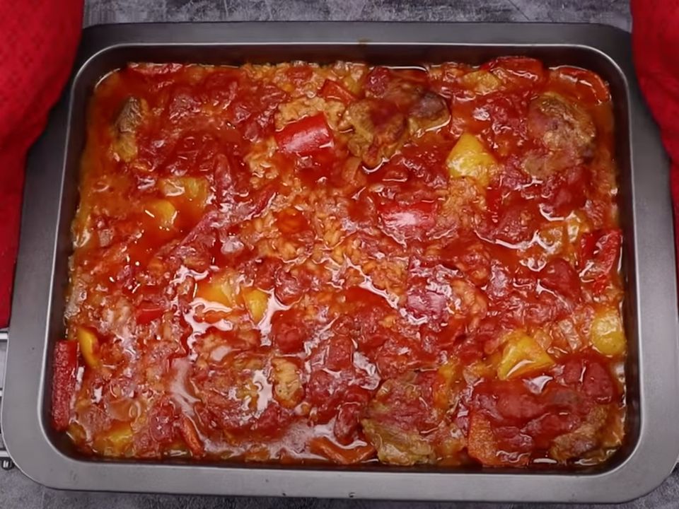 Тушковане м'ясо з цибулею присипаємо чорним меленим перцем, всипаємо 2 ч.л. паприки, перемішуємо і вливаємо 400 мл гарячої води. Знову накриваємо страву кришкою і тушкуємо на слабкому вогні 20 хвилин. М'ясо за цей час стане м'яким.