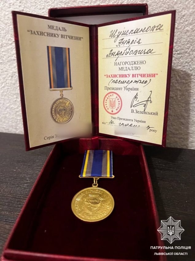 Патрульний поліцейський зі Львівщини Андрій Шушпанов, який боронив Україну в лавах бойової бригади «Хижак», отримав державну нагороду посмертно. Відзнаку за мужність та самовідданість днями вручили дружині захисника. Про це повідомили в патрульній поліції Львівської області.