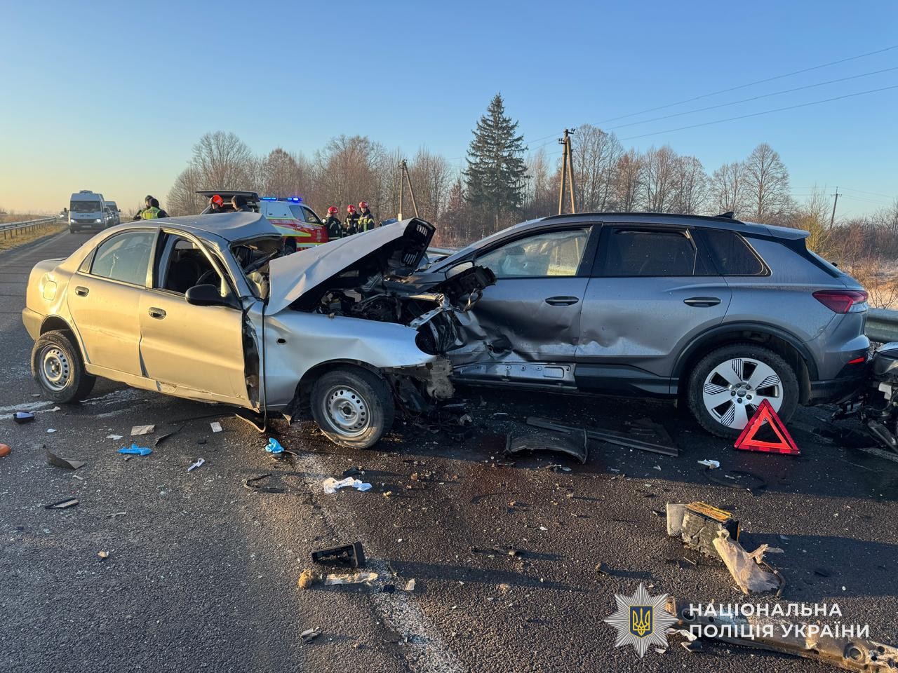 Як попередньо встановили правоохоронці, водій автомобіля Daewoo Lanos, 23-річний мешканець Самбірського району, не впорався з керуванням та виїхав на смугу зустрічного руху, де його автомобіль зіткнувся з Audi E-tron під керуванням жителя Львова віком 26 років. Після цього Audi e-tron зіткнувся з автомобілем Volkswagen Passat, яким керував 39-річний львів’янин.