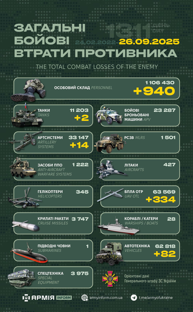Загальні бойові втрати противника з 24.02.22 по 26.09.25 орієнтовно становлять: