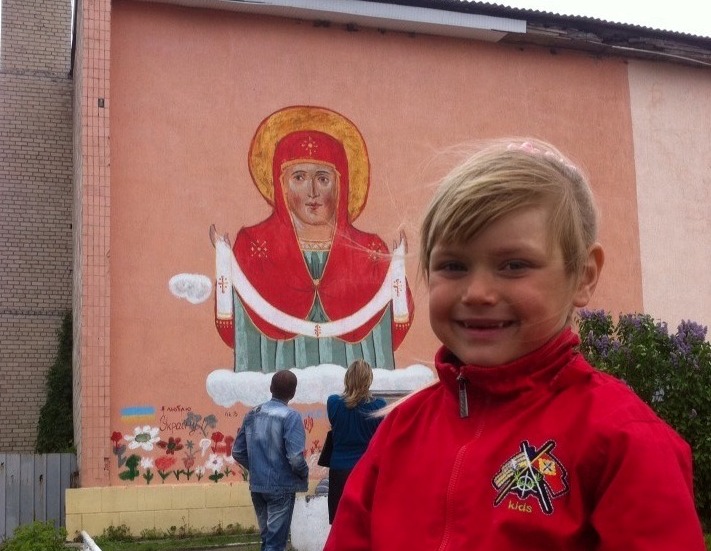 У Станиці Луганській – на крайньому рубежі території, підконтрольної українському війську, відомий іконописець Лев Скоп на стіні місцевого будинку культури створив образ Пресвятої Покрови.