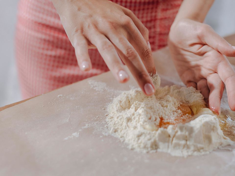 У зручній мисці або просто на столі добре просіяти борошно і зробити невелике заглиблення по середині. Цей крок потрібний, щоб борошно було насичене киснем, що робить його більш легким та пухким, а це у свою чергу сприяє кращому замішуванню та розвитку клейковини. Крім того, просіювання видаляє можливі грудочки або дрібні домішки. Створення заглиблення дозволяє поступово вводити рідину в борошно.